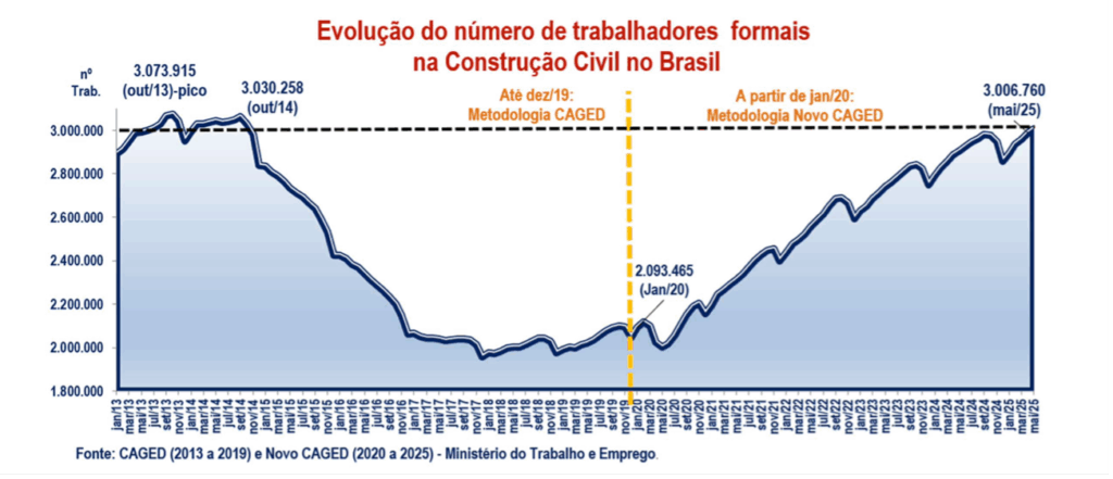 A construção civil segue como uma das principais locomotivas da geração de empregos no país. Entre janeiro e maio de 2025, o setor criou 149,2 mil novas vagas formais — número inferior ao registrado em 2024, mas superior ao de 2023. Os três segmentos da atividade — construção de edifícios, infraestrutura e serviços especializados — registraram saldo positivo no período.
