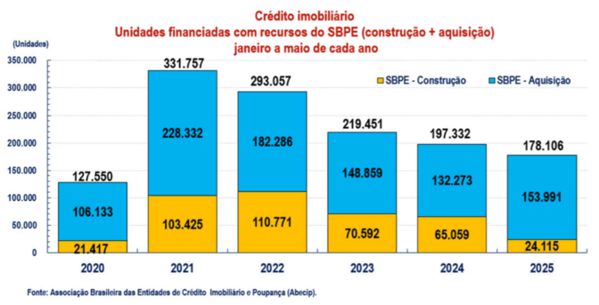Um dos pontos mais críticos do período foi a forte retração no crédito voltado à produção no setor. Nos primeiros cinco meses de 2025, foram financiadas apenas 24.115 unidades com recursos do Sistema Brasileiro de Poupança e Empréstimo (SBPE), uma redução de 62,9% em relação ao mesmo período de 2024. Em valores, a queda chegou a 54,1%, passando de R$ 15,5 bilhões para R$ 7,1 bilhões.