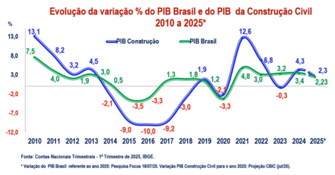 No entanto, o Índice de Confiança do Empresário da Construção (que integra a Sondagem) recuou para 47,1 pontos em julho, menor valor do ano. A percepção negativa está relacionada à alta dos juros, à Inflação acumulada em 12 meses (5,35%) e às incertezas macroeconômicas, como a política fiscal e a nova tarifação de produtos brasileiros nos Estados Unidos. O Índice mede o grau de otimismo ou pessimismo dos empresários do setor da construção civil em relação ao ambiente atual e às perspectivas para os próximos meses.