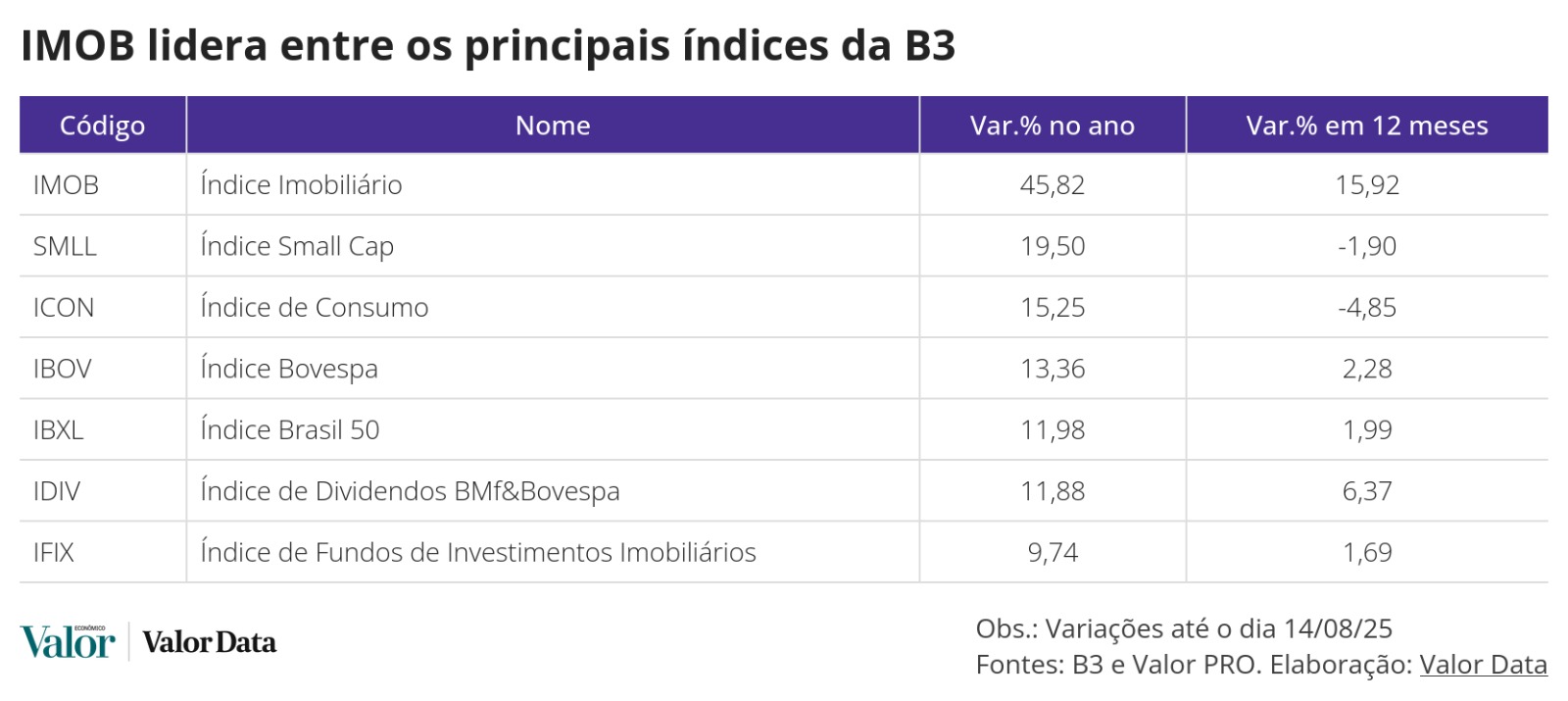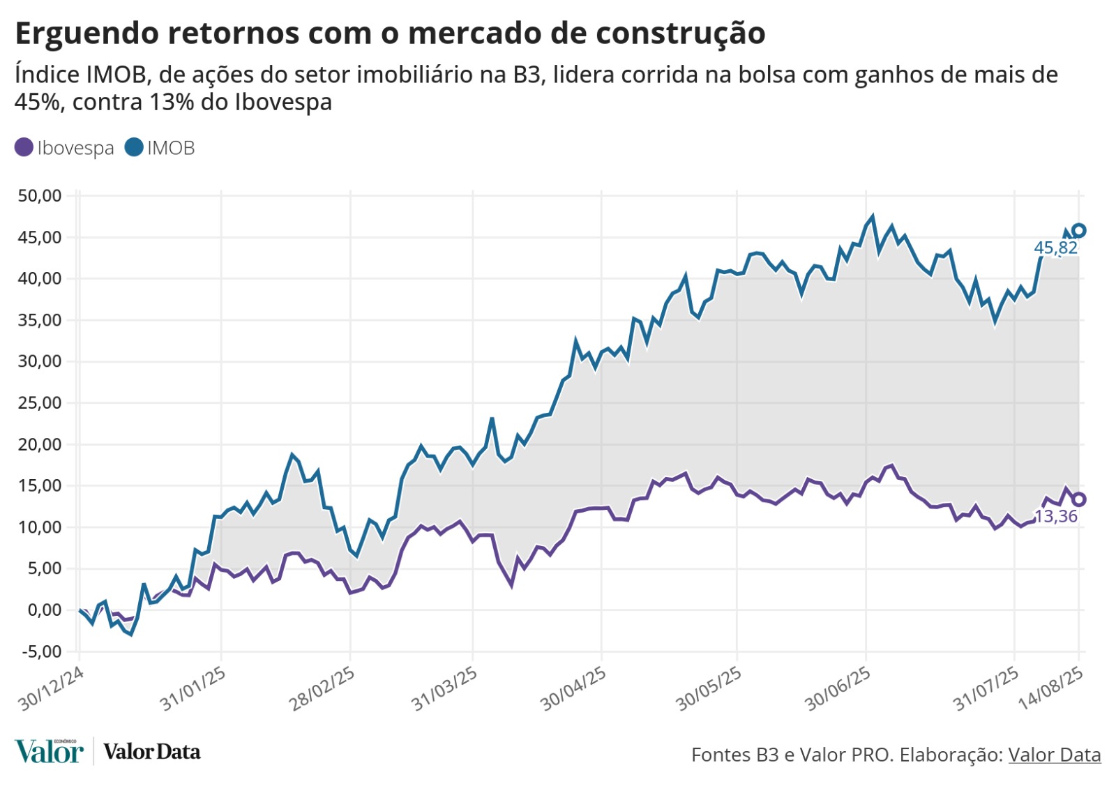 Depois de um final pessimista em 2024 no mercado de capitais, tijolo por tijolo, as empresas do setor imobiliário construíram alguns dos melhores retornos para seus investidores neste ano. Nenhum índice setorial da B3 subiu à mesma altura, tendo o IMOB, que reúne ações de construção civil e shoppings, valorizado 45,8% do começo de 2025 até a última quinta-feira, 14 de agosto.