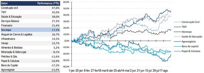 Confira a performance setorial no acumulado do ano, segundo dados do BTG Pactual: