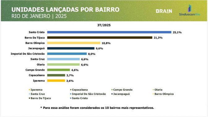 Olhando para os bairros, o maior volume de unidades lançadas foi, pelo quarto ano seguido, no Porto Maravilha, seguido da Barra da Tijuca. Nas vendas, foi mantido o patamar de R$ 14,5 bilhões de 2024 — com destaque, mais uma vez, para o segmento compacto, que saltou de 16% das vendas de 2024 para 21%, em 2025.
